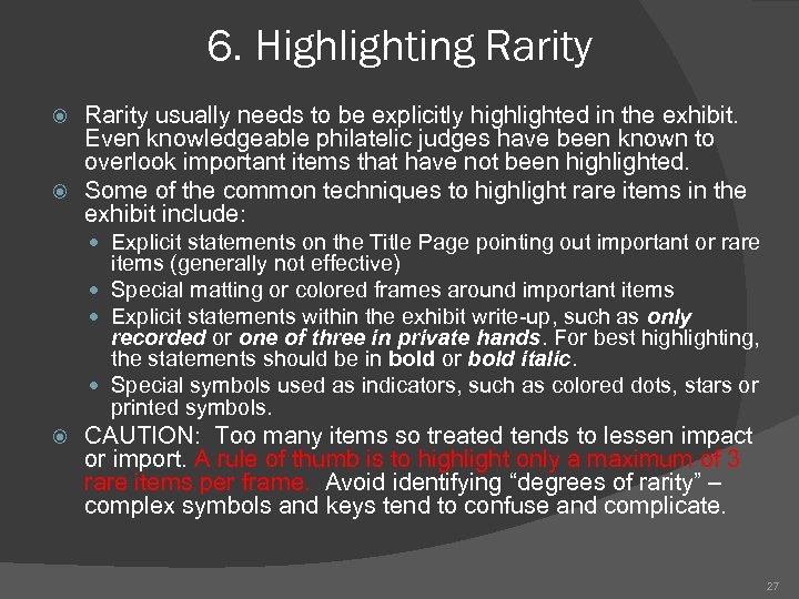 6. Highlighting Rarity usually needs to be explicitly highlighted in the exhibit. Even knowledgeable philatelic judges have been known to overlook important items that have not been highlighted. Some of the common techniques to highlight rare items in the exhibit include: Explicit statements on the Title Page pointing out important or rare items (generally not effective) Special matting or colored frames around important items Explicit statements within the exhibit write-up, such as only recorded or one of three in private hands. For best highlighting, the statements should be in bold or bold italic. Special symbols used as indicators, such as colored dots, stars or printed symbols. CAUTION: Too many items so treated tends to lessen impact or import. A rule of thumb is to highlight only a maximum of 3 rare items per frame. Avoid identifying “degrees of rarity” – complex symbols and keys tend to confuse and complicate. 27