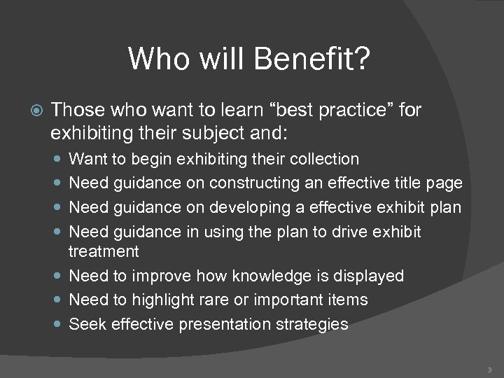 Who will Benefit? Those who want to learn “best practice” for exhibiting their subject and: Want to begin exhibiting their collection Need guidance on constructing an effective title page Need guidance on developing a effective exhibit plan Need guidance in using the plan to drive exhibit treatment Need to improve how knowledge is displayed Need to highlight rare or important items Seek effective presentation strategies 3