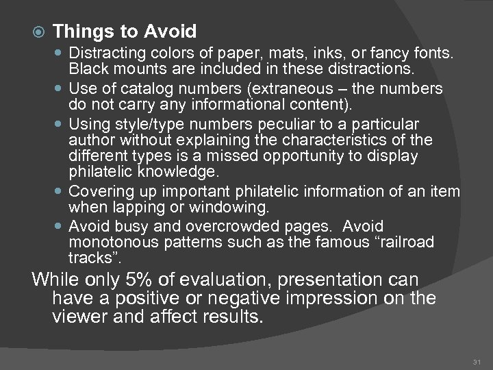 Things to Avoid Distracting colors of paper, mats, inks, or fancy fonts. Black mounts are included in these distractions. Use of catalog numbers (extraneous – the numbers do not carry any informational content). Using style/type numbers peculiar to a particular author without explaining the characteristics of the different types is a missed opportunity to display philatelic knowledge. Covering up important philatelic information of an item when lapping or windowing. Avoid busy and overcrowded pages. Avoid monotonous patterns such as the famous “railroad tracks”. While only 5% of evaluation, presentation can have a positive or negative impression on the viewer and affect results. 31
