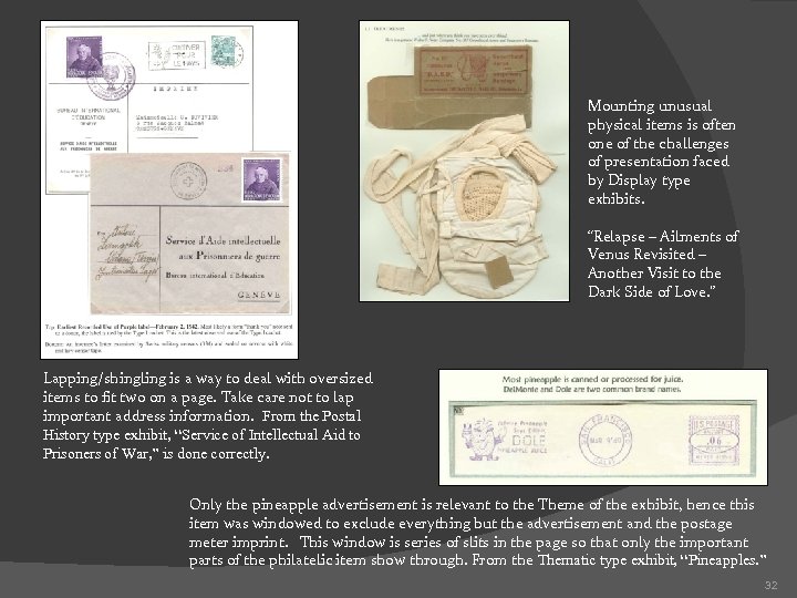 Mounting unusual physical items is often one of the challenges of presentation faced by Display type exhibits. “Relapse – Ailments of Venus Revisited – Another Visit to the Dark Side of Love. ” Lapping/shingling is a way to deal with oversized items to fit two on a page. Take care not to lap important address information. From the Postal History type exhibit, “Service of Intellectual Aid to Prisoners of War, ” is done correctly. Only the pineapple advertisement is relevant to the Theme of the exhibit, hence this item was windowed to exclude everything but the advertisement and the postage meter imprint. This window is series of slits in the page so that only the important parts of the philatelic item show through. From the Thematic type exhibit, “Pineapples. ” 32