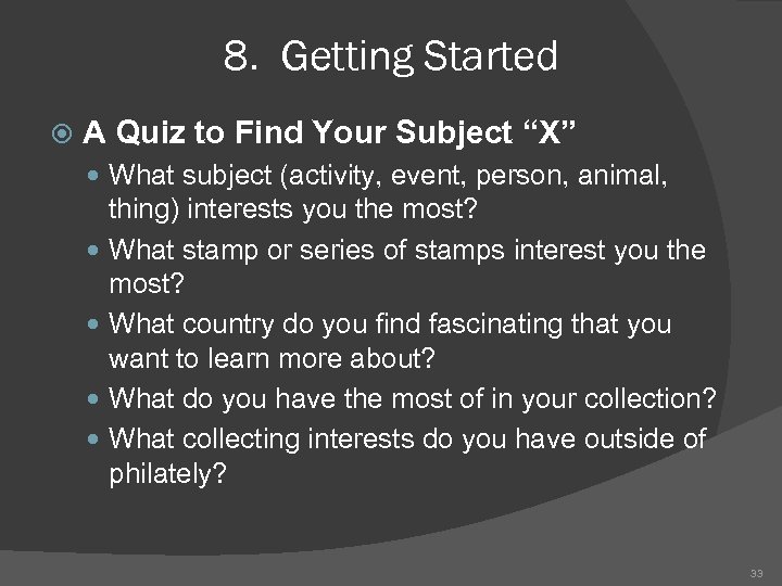 8. Getting Started A Quiz to Find Your Subject “X” What subject (activity, event, person, animal, thing) interests you the most? What stamp or series of stamps interest you the most? What country do you find fascinating that you want to learn more about? What do you have the most of in your collection? What collecting interests do you have outside of philately? 33