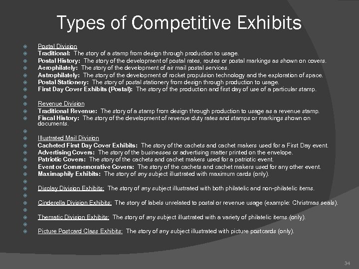 Types of Competitive Exhibits Postal Division Traditional: The story of a stamp from design through production to usage. Postal History: The story of the development of postal rates, routes or postal markings as shown on covers. Aerophilately: The story of the development of air mail postal services. Astrophilately: The story of the development of rocket propulsion technology and the exploration of space. Postal Stationery: The story of postal stationery from design through production to usage. First Day Cover Exhibits (Postal): The story of the production and first day of use of a particular stamp. Revenue Division Traditional Revenue: The story of a stamp from design through production to usage as a revenue stamp. Fiscal History: The story of the development of revenue duty rates and stamps or markings shown on documents. Illustrated Mail Division Cacheted First Day Cover Exhibits: The story of the cachets and cachet makers used for a First Day event. Advertising Covers: The story of the businesses or advertising matter printed on the envelope. Patriotic Covers: The story of the cachets and cachet makers used for a patriotic event. Event or Commemorative Covers: The story of the cachets and cachet makers used for any other event. Maximaphily Exhibits: The story of any subject illustrated with maximum cards (only). Display Division Exhibits: The story of any subject illustrated with both philatelic and non-philatelic items. Cinderella Division Exhibits: The story of labels unrelated to postal or revenue usage (example: Christmas seals). Thematic Division Exhibits: The story of any subject illustrated with a variety of philatelic items (only). Picture Postcard Class Exhibits: The story of any subject illustrated with picture postcards (only). 34