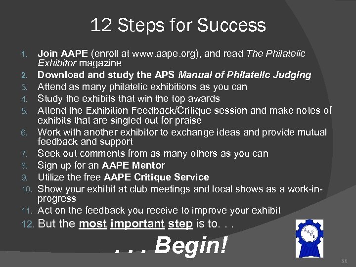 12 Steps for Success 1. 2. 3. 4. 5. 6. 7. 8. 9. 10. 11. Join AAPE (enroll at www. aape. org), and read The Philatelic Exhibitor magazine Download and study the APS Manual of Philatelic Judging Attend as many philatelic exhibitions as you can Study the exhibits that win the top awards Attend the Exhibition Feedback/Critique session and make notes of exhibits that are singled out for praise Work with another exhibitor to exchange ideas and provide mutual feedback and support Seek out comments from as many others as you can Sign up for an AAPE Mentor Utilize the free AAPE Critique Service Show your exhibit at club meetings and local shows as a work-inprogress Act on the feedback you receive to improve your exhibit 12. But the most important step is to. . . Begin! 35