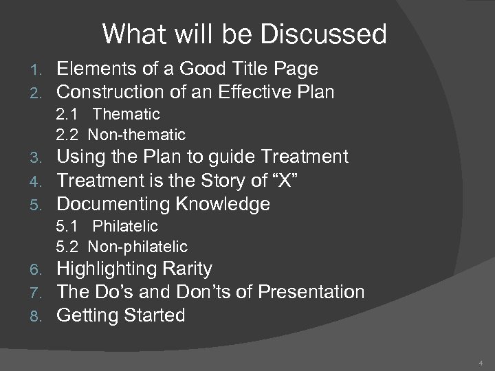 What will be Discussed 1. 2. Elements of a Good Title Page Construction of an Effective Plan 2. 1 Thematic 2. 2 Non-thematic 3. 4. 5. Using the Plan to guide Treatment is the Story of “X” Documenting Knowledge 5. 1 Philatelic 5. 2 Non-philatelic 6. 7. 8. Highlighting Rarity The Do’s and Don’ts of Presentation Getting Started 4