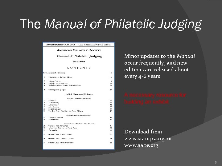 The Manual of Philatelic Judging Minor updates to the Manual occur frequently, and new editions are released about every 4 -6 years A necessary resource for building an exhibit Download from www. stamps. org or www. aape. org 5