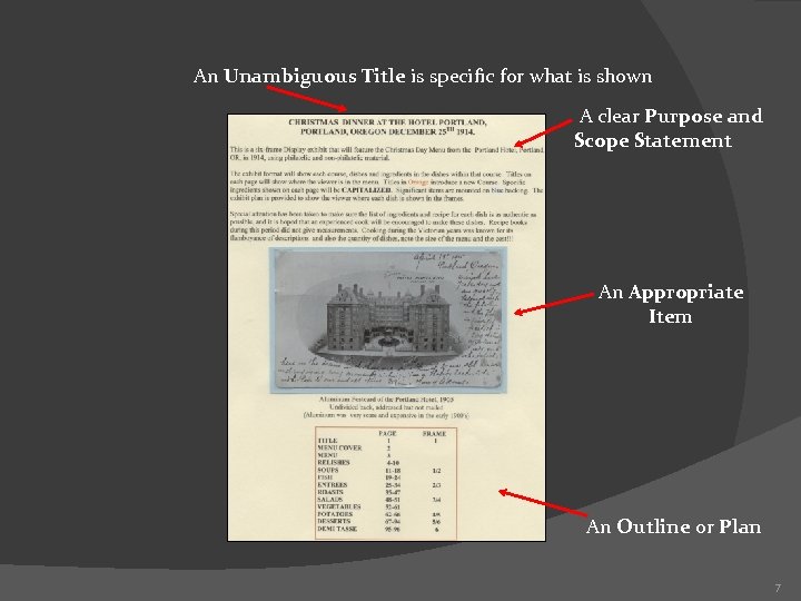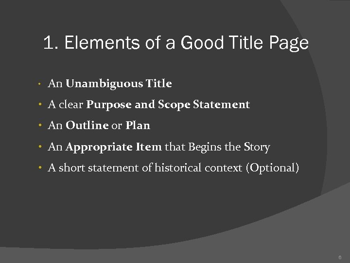 1. Elements of a Good Title Page • An Unambiguous Title • A clear Purpose and Scope Statement • An Outline or Plan • An Appropriate Item that Begins the Story • A short statement of historical context (Optional) 6