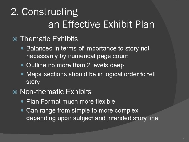 2. Constructing an Effective Exhibit Plan Thematic Exhibits Balanced in terms of importance to story not necessarily by numerical page count Outline no more than 2 levels deep Major sections should be in logical order to tell story Non-thematic Exhibits Plan Format much more flexible Can range from simple to more complex depending upon subject and intended story line. 8