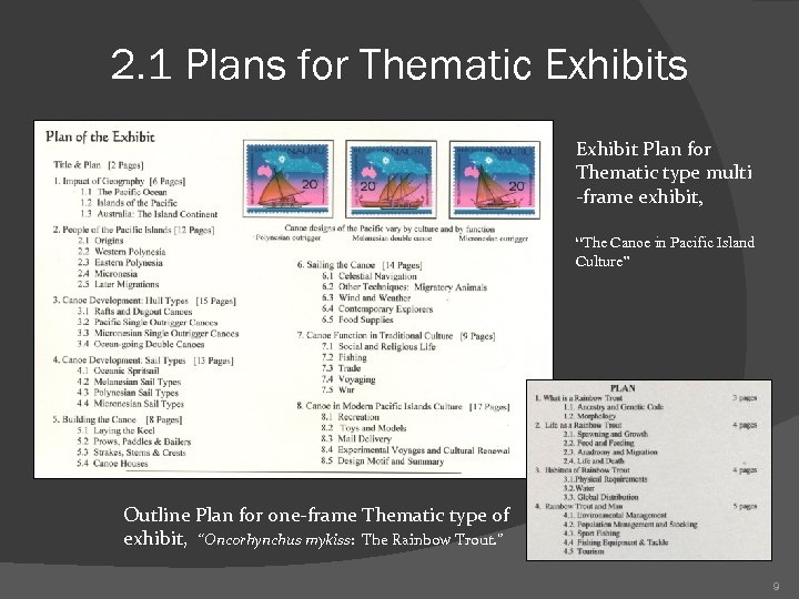 2. 1 Plans for Thematic Exhibits Exhibit Plan for Thematic type multi -frame exhibit, “The Canoe in Pacific Island Culture” Outline Plan for one-frame Thematic type of exhibit, “Oncorhynchus mykiss: The Rainbow Trout. ” 9