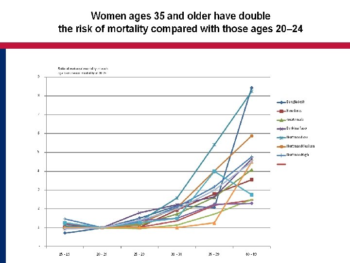Impact of Short Interpregnancy Intervals • Infants: increased risk of neonatal and perinatal mortality, low birth weight, preterm delivery • Children: mortality for children born 2 to 4 years apart is 75 per 1000 live births; for those born less than 2 years apart, it rises to 134 per 1000 • Mothers: higher risk of mortality, pre-eclampsia, ruptured membranes, anemia, high blood pressure • Infants whose mothers die are 3 to 10 times more likely to die before age one, compared to infants whose mothers live Rutstein, DHS, 2005 • Adolescent girls: pregnancy– related complications are the leading cause of mortality Girls age 15 to 19 are twice as likely to die as women age 20 – 24 Girls under 15 are 5 times more likely to die than those 20 - 24 Infants of teenage girls are almost twice as likely to die as those born to women age 20 – 29 SAVE, 2007, Guttmacher 2002 • • •