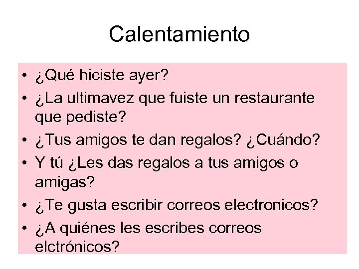 Calentamiento • ¿Qué hiciste ayer? • ¿La ultimavez que fuiste un restaurante que pediste? • ¿Tus amigos te dan regalos? ¿Cuándo? • Y tú ¿Les das regalos a tus amigos o amigas? • ¿Te gusta escribir correos electronicos? • ¿A quiénes les escribes correos elctrónicos?