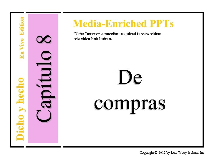 Capítulo 8 En Vivo Edition Dicho y hecho Media-Enriched PPTs Note: Internet connection required to view videos via video link button. De compras Copyright © 2012 by John Wiley & Sons, Inc.