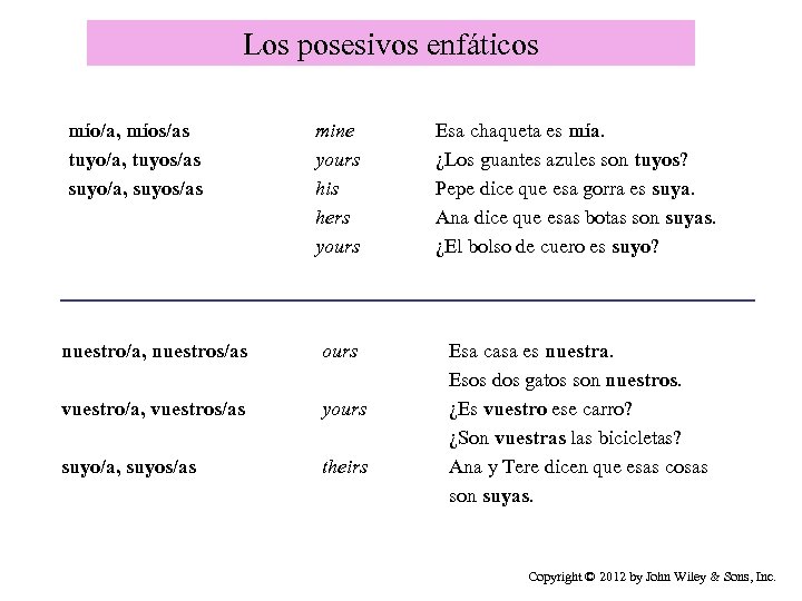 Los posesivos enfáticos mío/a, míos/as tuyo/a, tuyos/as suyo/a, suyos/as mine yours his hers yours Esa chaqueta es mía. ¿Los guantes azules son tuyos? Pepe dice que esa gorra es suya. Ana dice que esas botas son suyas. ¿El bolso de cuero es suyo? nuestro/a, nuestros/as ours vuestro/a, vuestros/as yours suyo/a, suyos/as theirs Esa casa es nuestra. Esos dos gatos son nuestros. ¿Es vuestro ese carro? ¿Son vuestras las bicicletas? Ana y Tere dicen que esas cosas son suyas. Copyright © 2012 by John Wiley & Sons, Inc.