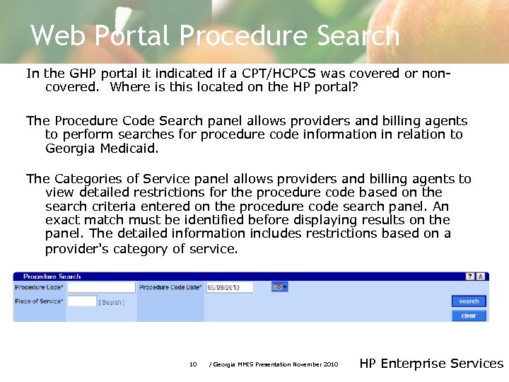 Web Portal Procedure Search In the GHP portal it indicated if a CPT/HCPCS was covered or noncovered. Where is this located on the HP portal? The Procedure Code Search panel allows providers and billing agents to perform searches for procedure code information in relation to Georgia Medicaid. The Categories of Service panel allows providers and billing agents to view detailed restrictions for the procedure code based on the search criteria entered on the procedure code search panel. An exact match must be identified before displaying results on the panel. The detailed information includes restrictions based on a provider's category of service. 10 / Georgia MMIS Presentation November 2010 HP Enterprise Services