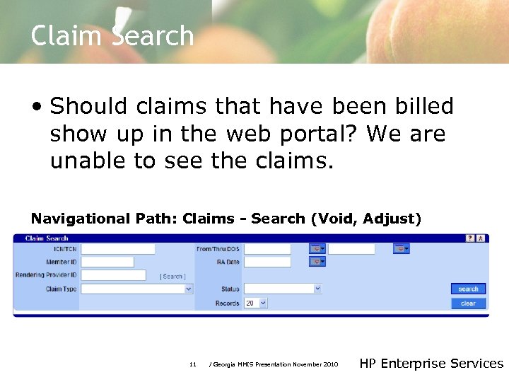 Claim Search • Should claims that have been billed show up in the web portal? We are unable to see the claims. Navigational Path: Claims - Search (Void, Adjust) 11 / Georgia MMIS Presentation November 2010 HP Enterprise Services