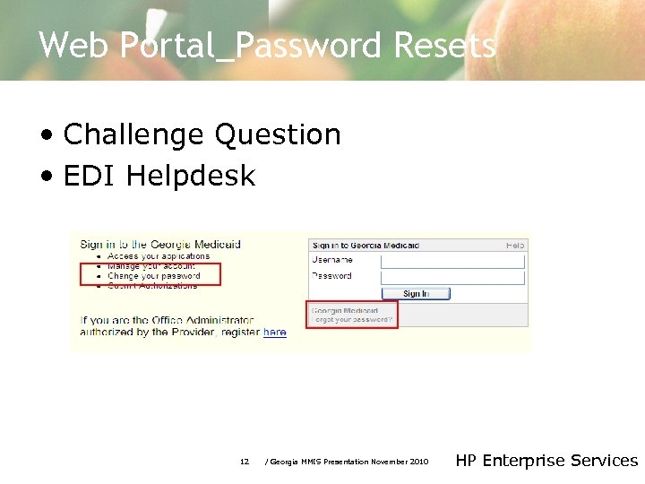Web Portal_Password Resets • Challenge Question • EDI Helpdesk 12 / Georgia MMIS Presentation November 2010 HP Enterprise Services