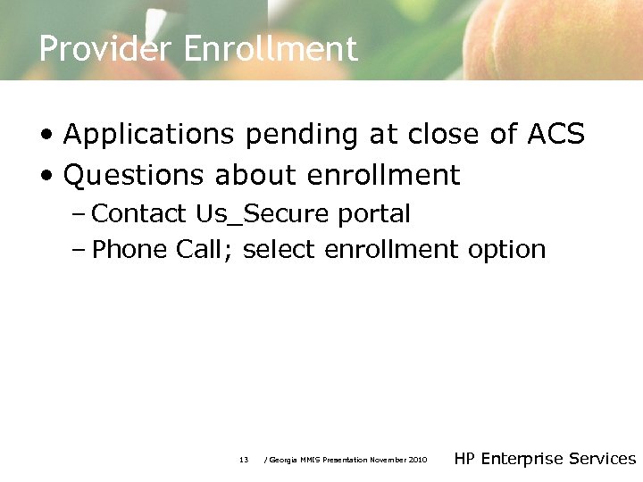 Provider Enrollment • Applications pending at close of ACS • Questions about enrollment – Contact Us_Secure portal – Phone Call; select enrollment option 13 / Georgia MMIS Presentation November 2010 HP Enterprise Services