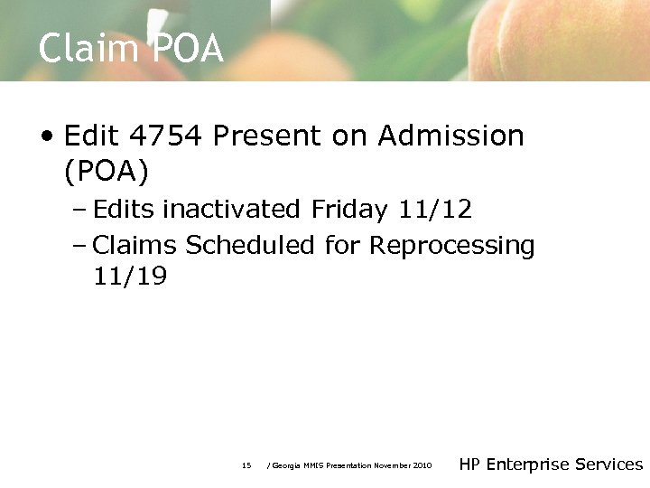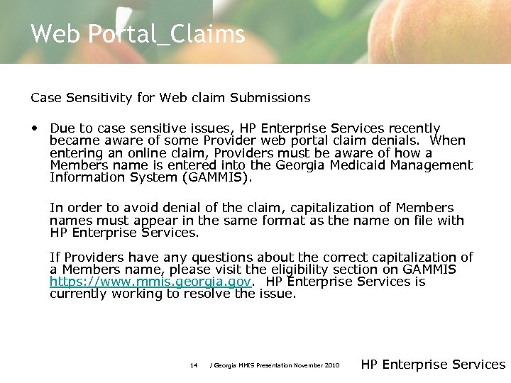 Web Portal_Claims Case Sensitivity for Web claim Submissions • Due to case sensitive issues, HP Enterprise Services recently became aware of some Provider web portal claim denials. When entering an online claim, Providers must be aware of how a Members name is entered into the Georgia Medicaid Management Information System (GAMMIS). In order to avoid denial of the claim, capitalization of Members names must appear in the same format as the name on file with HP Enterprise Services. If Providers have any questions about the correct capitalization of a Members name, please visit the eligibility section on GAMMIS https: //www. mmis. georgia. gov. HP Enterprise Services is currently working to resolve the issue. 14 / Georgia MMIS Presentation November 2010 HP Enterprise Services