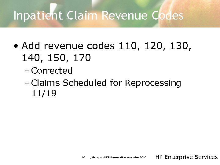 Inpatient Claim Revenue Codes • Add revenue codes 110, 120, 130, 140, 150, 170 – Corrected – Claims Scheduled for Reprocessing 11/19 16 / Georgia MMIS Presentation November 2010 HP Enterprise Services