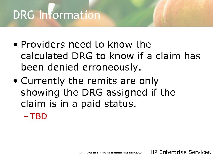 DRG Information • Providers need to know the calculated DRG to know if a claim has been denied erroneously. • Currently the remits are only showing the DRG assigned if the claim is in a paid status. – TBD 17 / Georgia MMIS Presentation November 2010 HP Enterprise Services