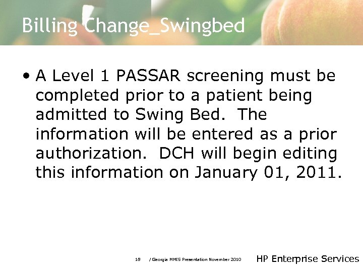 Billing Change_Swingbed • A Level 1 PASSAR screening must be completed prior to a patient being admitted to Swing Bed. The information will be entered as a prior authorization. DCH will begin editing this information on January 01, 2011. 18 / Georgia MMIS Presentation November 2010 HP Enterprise Services