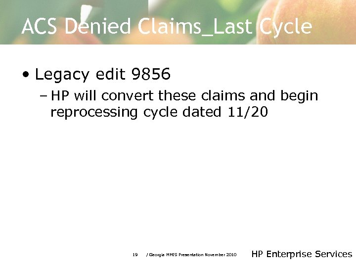 ACS Denied Claims_Last Cycle • Legacy edit 9856 – HP will convert these claims and begin reprocessing cycle dated 11/20 19 / Georgia MMIS Presentation November 2010 HP Enterprise Services