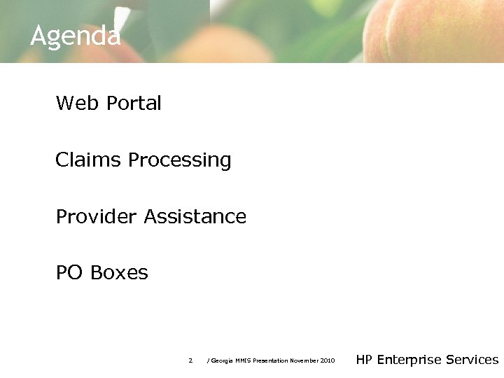 Agenda Web Portal Claims Processing Provider Assistance PO Boxes 2 / Georgia MMIS Presentation November 2010 HP Enterprise Services