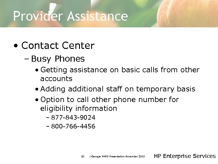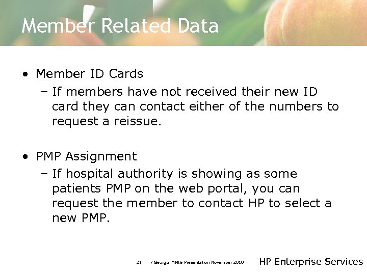Provider Assistance • Contact Center – Busy Phones • Getting assistance on basic calls from other accounts • Adding additional staff on temporary basis • Option to call other phone number for eligibility information – 877 -843 -9024 – 800 -766 -4456 20 / Georgia MMIS Presentation November 2010 HP Enterprise Services