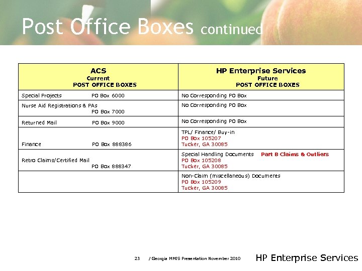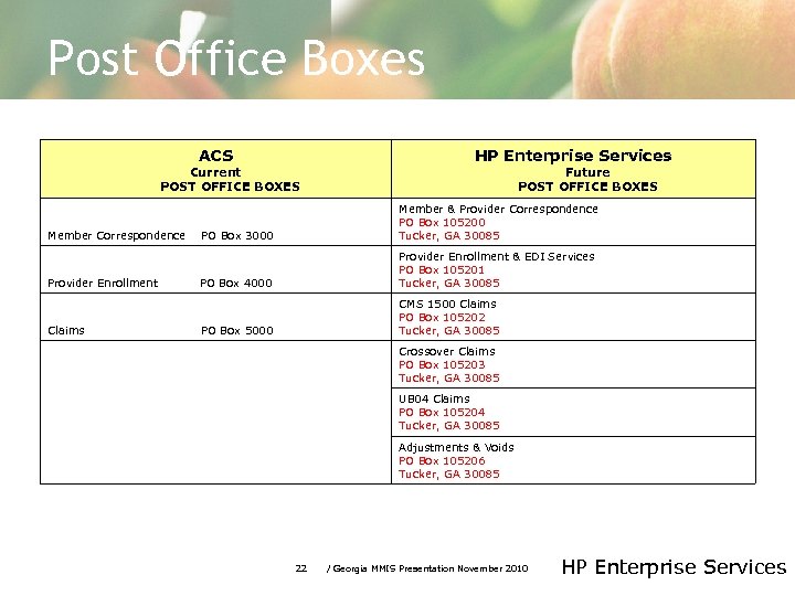 Post Office Boxes ACS Current POST OFFICE BOXES HP Enterprise Services Future POST OFFICE BOXES Member Correspondence PO Box 3000 Member & Provider Correspondence PO Box 105200 Tucker, GA 30085 Provider Enrollment PO Box 4000 Provider Enrollment & EDI Services PO Box 105201 Tucker, GA 30085 Claims PO Box 5000 CMS 1500 Claims PO Box 105202 Tucker, GA 30085 Crossover Claims PO Box 105203 Tucker, GA 30085 UB 04 Claims PO Box 105204 Tucker, GA 30085 Adjustments & Voids PO Box 105206 Tucker, GA 30085 22 / Georgia MMIS Presentation November 2010 HP Enterprise Services