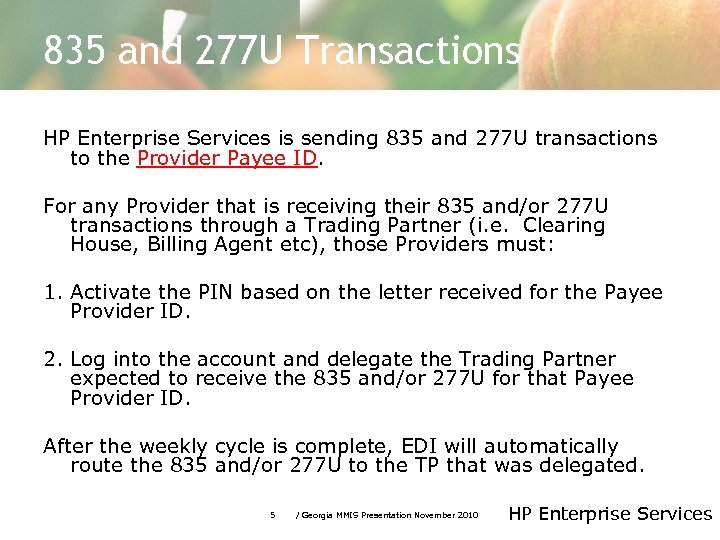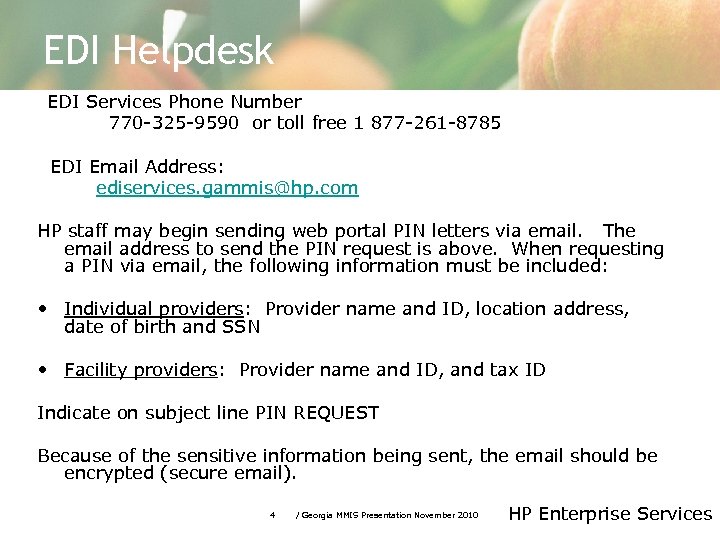 EDI Helpdesk EDI Services Phone Number 770 -325 -9590 or toll free 1 877 -261 -8785 EDI Email Address: ediservices. gammis@hp. com HP staff may begin sending web portal PIN letters via email. The email address to send the PIN request is above. When requesting a PIN via email, the following information must be included: • Individual providers: Provider name and ID, location address, date of birth and SSN • Facility providers: Provider name and ID, and tax ID Indicate on subject line PIN REQUEST Because of the sensitive information being sent, the email should be encrypted (secure email). 4 / Georgia MMIS Presentation November 2010 HP Enterprise Services