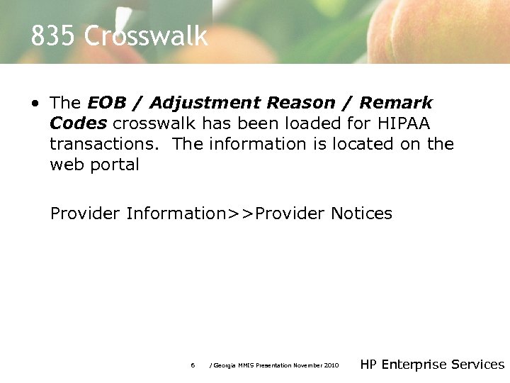 835 Crosswalk • The EOB / Adjustment Reason / Remark Codes crosswalk has been loaded for HIPAA transactions. The information is located on the web portal Provider Information>>Provider Notices 6 / Georgia MMIS Presentation November 2010 HP Enterprise Services