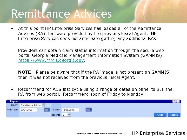 Paper RAs In cooperation with the Department of Community Health (DCH), HP Enterprise Services will no longer provide a paper Provider Remittance Advices (RA). In order to obtain your RA, Providers can log into the secure web portal Georgia Medicaid Management Information System (GAMMIS) https: //www. mmis. georgia. gov with your payee identification number and follow the steps below: 1. Click on Reports 2. Then click on Financial Reports 3. Click on the drop-down tab and select Remittance Advice 4. Enter the From Date and To Date 5. Click Search 8 / Georgia MMIS Presentation November 2010 HP Enterprise Services