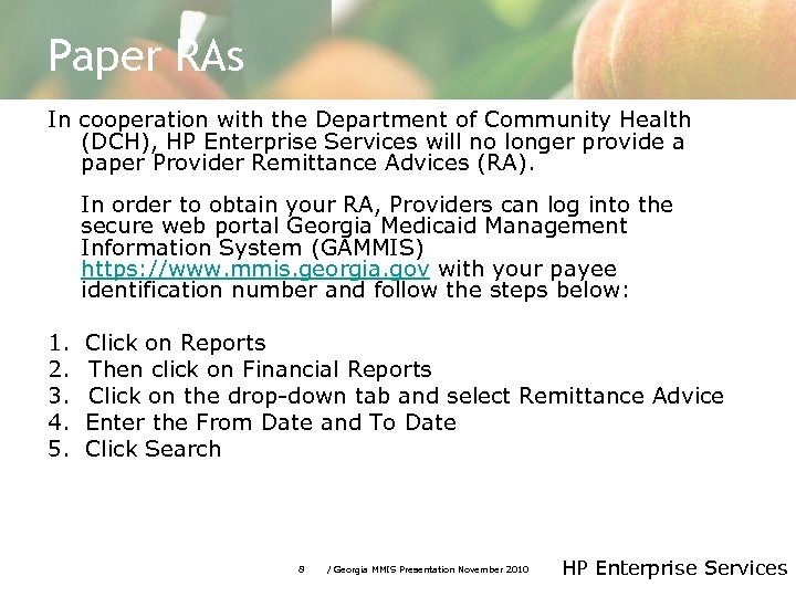 Remittance Advices • At this point HP Enterprise Services has loaded all of the Remittance Advices (RA) that were provided by the previous Fiscal Agent. HP Enterprise Services does not anticipate getting any additional RAs. Providers can obtain claim status information through the secure web portal Georgia Medicaid Management Information System (GAMMIS) https: //www. mmis. georgia. gov. NOTE: Please be aware that if the RA image is not present on GAMMIS then it was not received from the previous Fiscal Agent. • Recommend for ACS last cycle using a range of dates on panel to pull the RA from web portal. Recommend span of Friday to Monday. 7 / Georgia MMIS Presentation November 2010 HP Enterprise Services