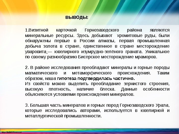http: //linda 6035. ucoz. ru/ 1. Визитной карточкой Горнозаводского района являются минеральные ресурсы. Здесь добывают хромитовые руды, были обнаружены первые в России алмазы, первая промышленная добыча золота в стране, единственное в стране месторождение уваровита — ювелирного изумрудно-зелёного граната. Уникальное по своему разнообразию Бисерское месторождение мраморов. 2. В районе исследования преобладают минералы и горные породы магматического и метаморфического происхождения. Таким образом, наша гипотеза подтвердилась частично. Из свойств можно выделить преобладание зернистого строения, высокую плотность, наличие блеска. Данные особенности объясняются условиями происхождения минералов. 3. Большая часть минералов и горных пород Горнозаводского Урала, которые исследовались авторами, используется в ювелирной и металлургической промышленности. ВЫВОДЫ: