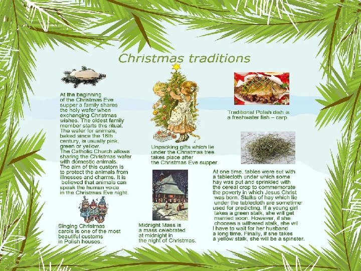 In former days, before Polish Christmas Trees were dominated by glass balls, most Christmas decorations had been prepared by children. They made Christmas chains using coloured tissue paper, wrappers and stems of straw. Children painted cones and walnuts gold, made angels and birds from eggshells, and prepared paper stars, bells and peacock eyes. These Christmas decorations, together with gingerbread and apples were then hung on Christmas Tree in the morning on the day before Christmas. Most of the decorations mentioned above can still be found on Polish Christmas trees, in particular at homes where people store decorations collected over generations. Each ornament has its own meaning. We have made traditional Polish Christmas decorations out of colored paper and stems of straw. The peacock eyes symbolise prosperity, while paper chains strengthen family ties and protect family members from troubles. We hope that the colored chains will also strengthen the ties between our schools.