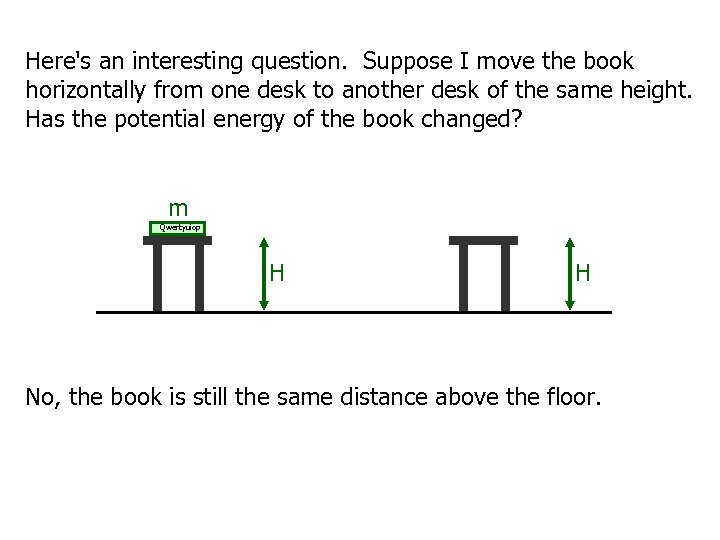 Here's an interesting question. Suppose I move the book horizontally from one desk to another desk of the same height. Has the potential energy of the book changed? m Qwertyuiop H H No, the book is still the same distance above the floor.