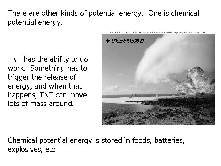 There are other kinds of potential energy. One is chemical potential energy. USS Atlanta (CL-104), 610 feet long. (Edward Jones Dome 600 x 747 feet) TNT has the ability to do work. Something has to trigger the release of energy, and when that happens, TNT can move lots of mass around. Chemical potential energy is stored in foods, batteries, explosives, etc.