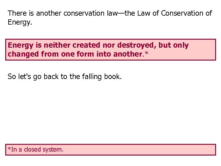 There is another conservation law—the Law of Conservation of Energy is neither created nor destroyed, but only changed from one form into another. * So let's go back to the falling book. *In a closed system.