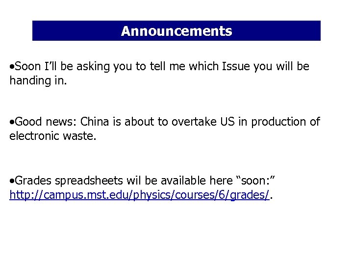 Announcements ·Soon I’ll be asking you to tell me which Issue you will be handing in. ·Good news: China is about to overtake US in production of electronic waste. ·Grades spreadsheets wil be available here “soon: ” http: //campus. mst. edu/physics/courses/6/grades/.