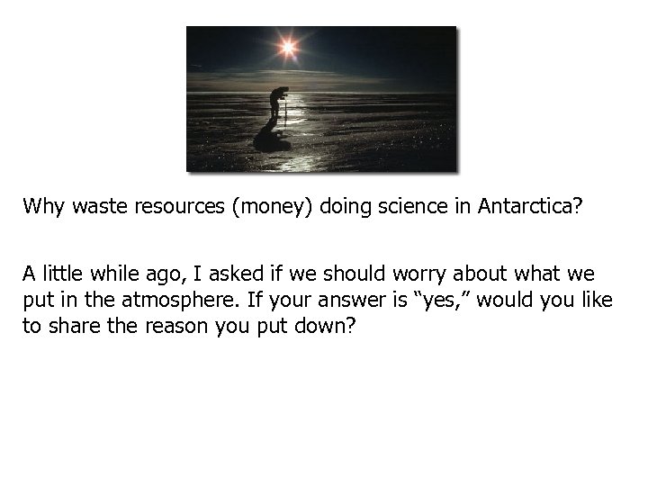 Why waste resources (money) doing science in Antarctica? A little while ago, I asked if we should worry about what we put in the atmosphere. If your answer is “yes, ” would you like to share the reason you put down?