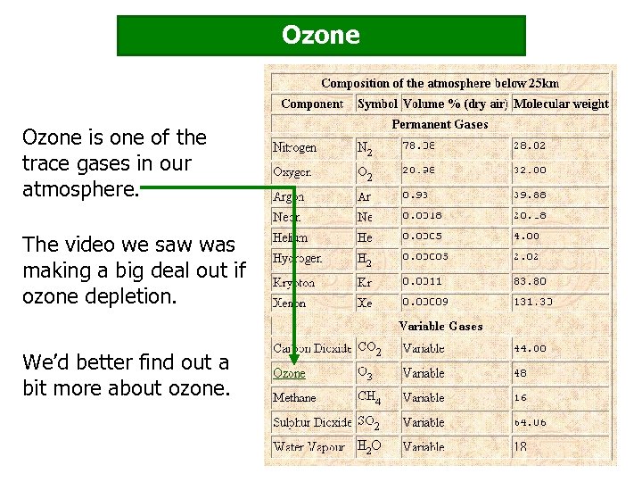 Ozone is one of the trace gases in our atmosphere. The video we saw was making a big deal out if ozone depletion. We’d better find out a bit more about ozone.