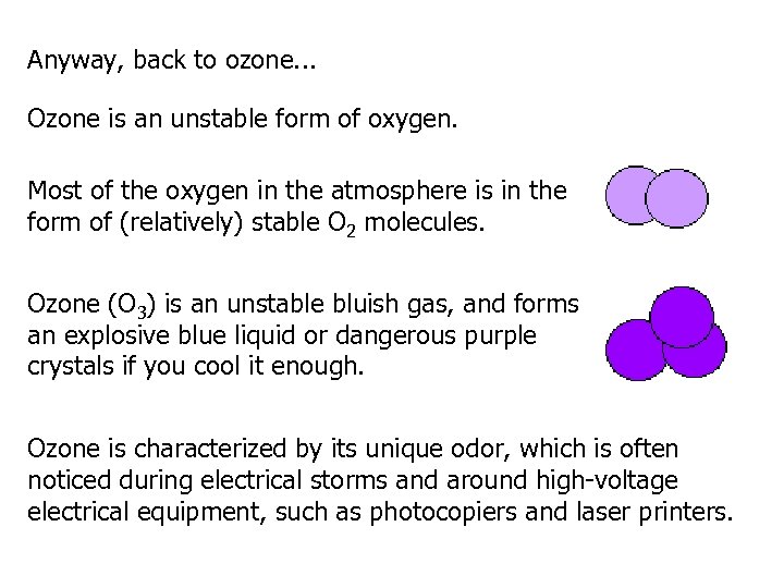 Anyway, back to ozone. . . Ozone is an unstable form of oxygen. Most of the oxygen in the atmosphere is in the form of (relatively) stable O 2 molecules. Ozone (O 3) is an unstable bluish gas, and forms an explosive blue liquid or dangerous purple crystals if you cool it enough. Ozone is characterized by its unique odor, which is often noticed during electrical storms and around high-voltage electrical equipment, such as photocopiers and laser printers.