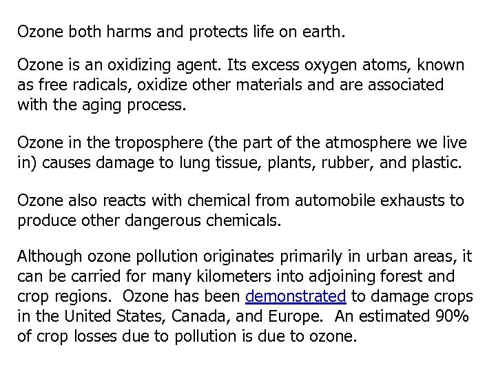 Ozone both harms and protects life on earth. Ozone is an oxidizing agent. Its excess oxygen atoms, known as free radicals, oxidize other materials and are associated with the aging process. Ozone in the troposphere (the part of the atmosphere we live in) causes damage to lung tissue, plants, rubber, and plastic. Ozone also reacts with chemical from automobile exhausts to produce other dangerous chemicals. Although ozone pollution originates primarily in urban areas, it can be carried for many kilometers into adjoining forest and crop regions. Ozone has been demonstrated to damage crops in the United States, Canada, and Europe. An estimated 90% of crop losses due to pollution is due to ozone.