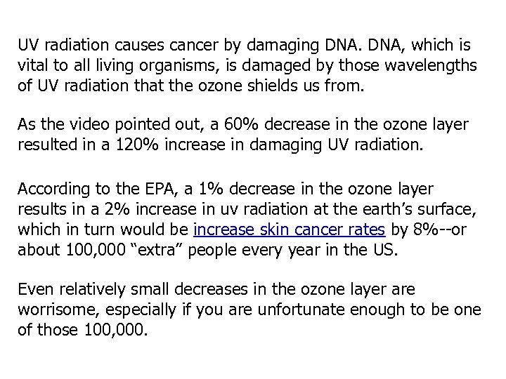 UV radiation causes cancer by damaging DNA, which is vital to all living organisms, is damaged by those wavelengths of UV radiation that the ozone shields us from. As the video pointed out, a 60% decrease in the ozone layer resulted in a 120% increase in damaging UV radiation. According to the EPA, a 1% decrease in the ozone layer results in a 2% increase in uv radiation at the earth’s surface, which in turn would be increase skin cancer rates by 8%--or about 100, 000 “extra” people every year in the US. Even relatively small decreases in the ozone layer are worrisome, especially if you are unfortunate enough to be one of those 100, 000.