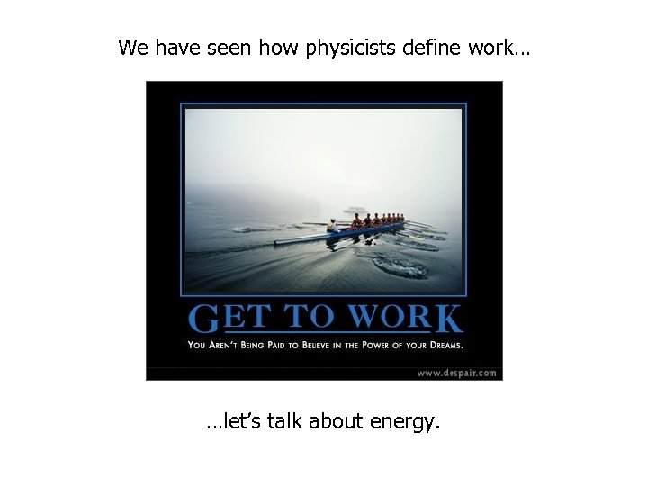 We have seen how physicists define work… …let’s talk about energy.