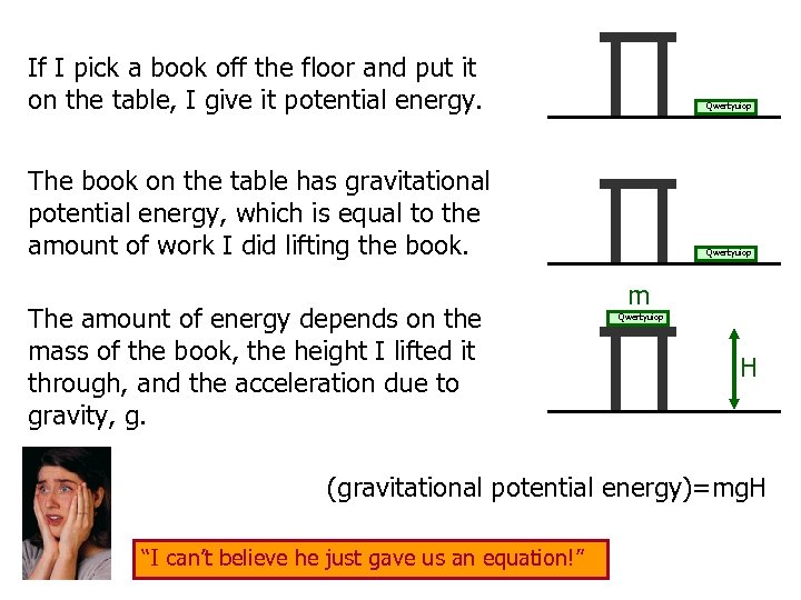 If I pick a book off the floor and put it on the table, I give it potential energy. Qwertyuiop The book on the table has gravitational potential energy, which is equal to the amount of work I did lifting the book. The amount of energy depends on the mass of the book, the height I lifted it through, and the acceleration due to gravity, g. Qwertyuiop m Qwertyuiop H (gravitational potential energy)=mg. H “I can’t believe he just gave us an equation!”
