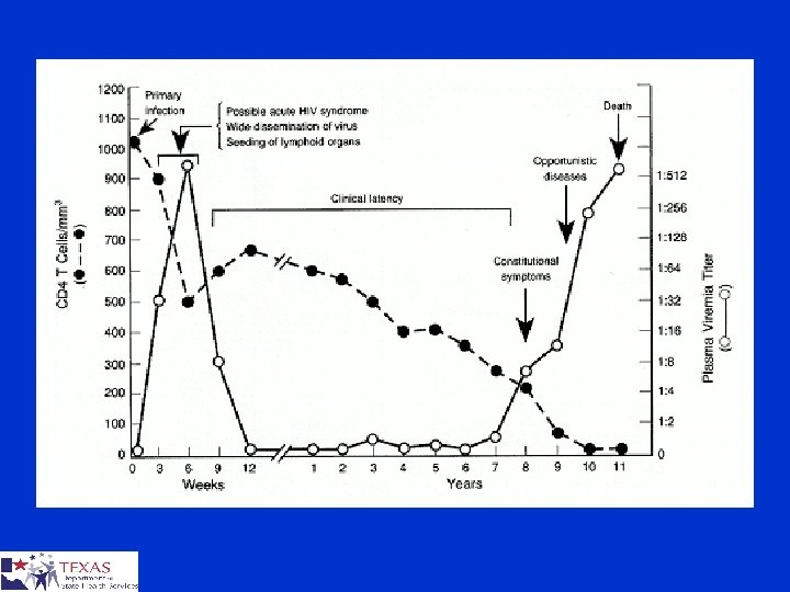 Disease Progression § Infection § Primary Infection/Antibody Development § Asymptomatic Period (10 -12 yrs average) § AIDS (Opportunistic infections, CD 4 200 or below)