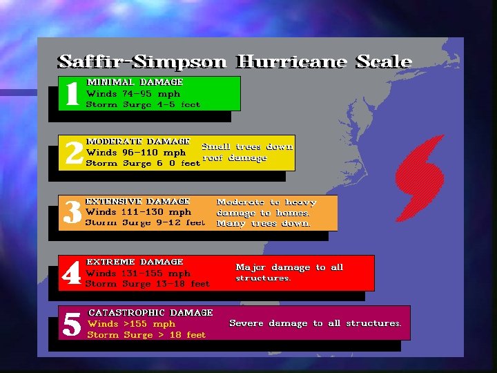 Hurricane n Definition n n Circulation n Tropical cyclones with winds exceeding 74 mph Counterclockwise around center in NH, opposite in SH Inverse relationship between central pressure and wind speed Stages of Development n n n Tropical Depression Tropical Storm Hurricane