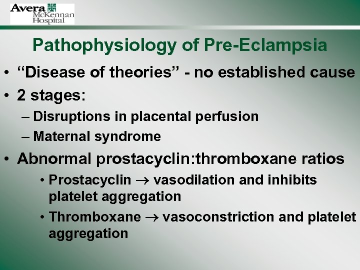 Pathophysiology of Pre-Eclampsia • “Disease of theories” - no established cause • 2 stages: – Disruptions in placental perfusion – Maternal syndrome • Abnormal prostacyclin: thromboxane ratios • Prostacyclin vasodilation and inhibits platelet aggregation • Thromboxane vasoconstriction and platelet aggregation