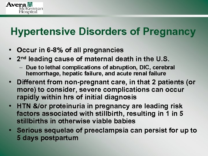 Hypertensive Disorders of Pregnancy • Occur in 6 -8% of all pregnancies • 2 nd leading cause of maternal death in the U. S. – Due to lethal complications of abruption, DIC, cerebral hemorrhage, hepatic failure, and acute renal failure • Different from non-pregnant care, in that 2 patients (or more) to consider, severe complications can occur rapidly within hrs of initial diagnosis • HTN &/or proteinuria in pregnancy are leading risk factors associated with stillbirth, resulting in 1 in 5 stillbirths in otherwise viable babies • Serious sequelae of preeclampsia can persist for up to 5 days postpartum