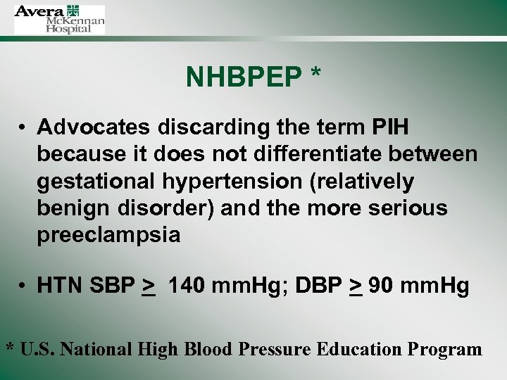 NHBPEP * • Advocates discarding the term PIH because it does not differentiate between gestational hypertension (relatively benign disorder) and the more serious preeclampsia • HTN SBP > 140 mm. Hg; DBP > 90 mm. Hg * U. S. National High Blood Pressure Education Program